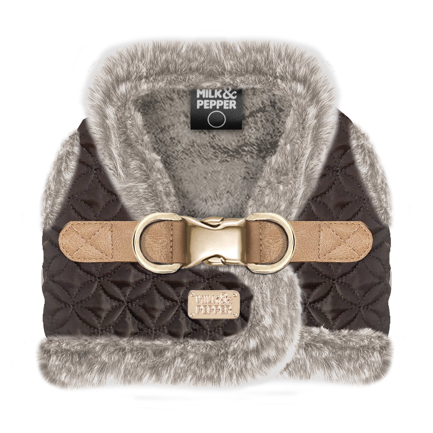 Harnas vestje. De buitenkant bestaat uit gemattelaseerde stof in een ebbenhout kleur. De binnenkant en de boorden (aan de hals en het buikje) alsook de openingen voor de voorpootjes bestaan uit een zacht taupe kleurig imitatie bont. Dit tuigje is praktisch en makkelijk aan te doen. Het hondje stapt met de voorpoten in het tuigje. Op de rug zit een velcro sluiting met daarboven een sluiting waaraan de leiband kan bevestigd worden. Bij dit tuigje past de leiband Victoria.