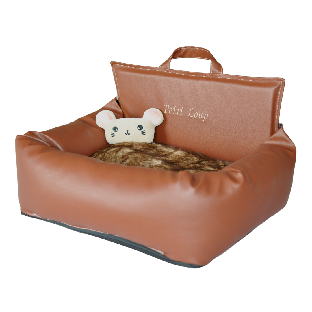 Prachtig klassieke autostoel, volledig in ecoleder en bijgevolg afwasbaar (indien een ongelukje wegens wagenziekte). Kussentje in faux fur. Twee aanleglijntjes. Achteraan zitten twee riempjes om de autogordel door te halen en te bevestigen. Het muizenkussentje Miu Muis is apart verkrijgbaar.