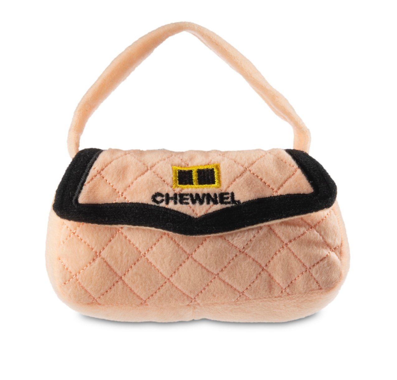 Schattig handtasje in pluche, met piepertje. Parodie op een bekend Frans couture merk. Ongeveer 14cm breed.