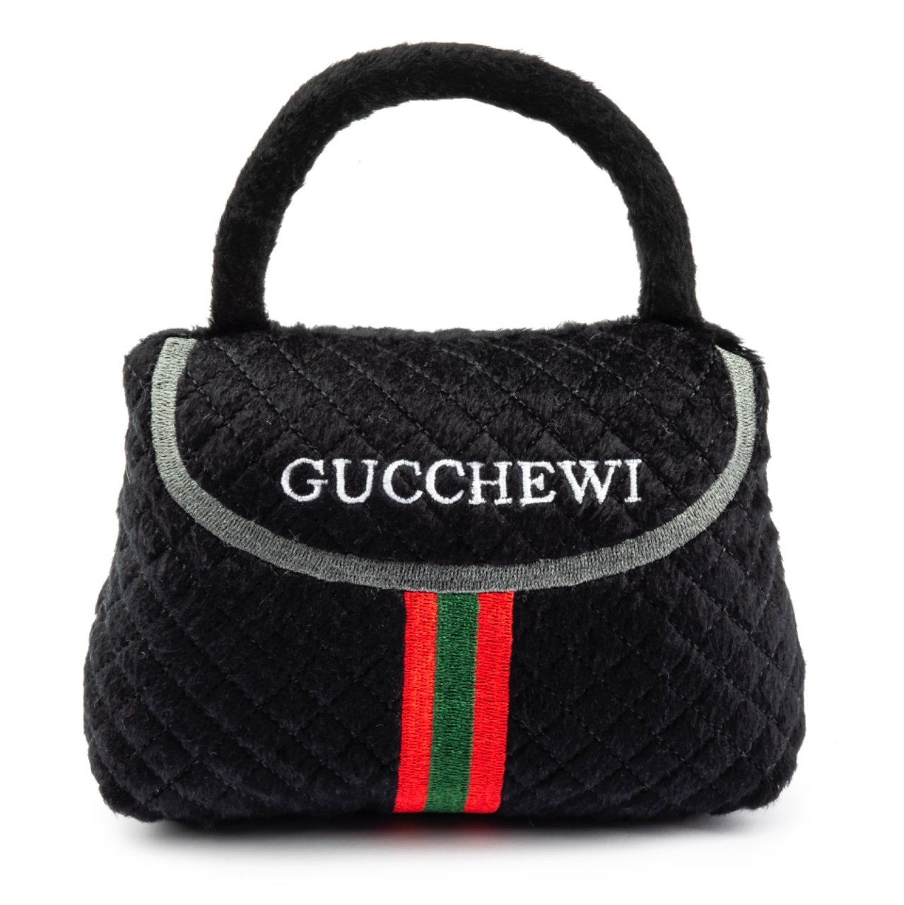 Schattig speeltje in de vorm van een handtasje in zachte pluche met piepertje. Parodie op een exclusief Italiaanse merk. Ongeveer 15cm breed.